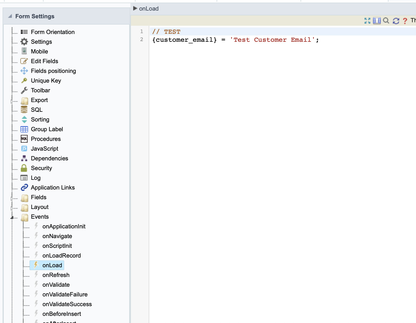 before I make a query email data from table Customers… I make a test if the New Field will show the data… with simple direct inject text data to {customer_email} new field onLoad event…